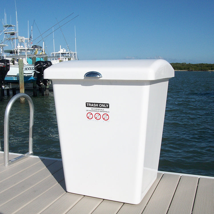 Our deluxe line of dock boxes and trash receptacles are not your everyday cookie cutter products that you see in many marine stores. They are high end, high quality, yet affordable products that have been missing from the market. Deluxe trash receptacles feature sleek rounded edges and domed lids. They are constructed from heavier duty white fiberglass with an average thickness of 1/4" to 3/8". All cut and exposed edges are gelcoated. The UV gel coated exterior provides long-lasting beauty and protection, while the interior features a white gel coat finish with black webbing. Stainless steel hinges on lid and are mounted with stainless steel lock nuts and machine screws (not riveted). Each box includes a stainless steel handle and braided stainless steel cable stays. Holds a Rubbermaid 32 Gallon or Brute XL Receptacle (not included).