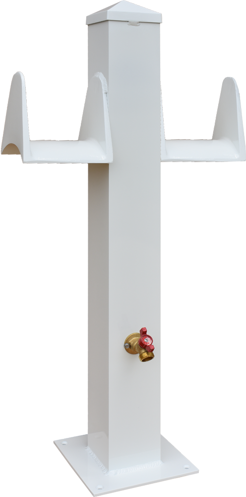 Our high quality water stanchions / hose stations will add an elegant touch to your dock or deck. They are crafted from aluminum, then are powder coated in a bright white finish for years of use. This unit includes two hose bibbs (spigots) and two cast aluminum hose holders. Each hose holder will accommodate up to a 50' water hose.