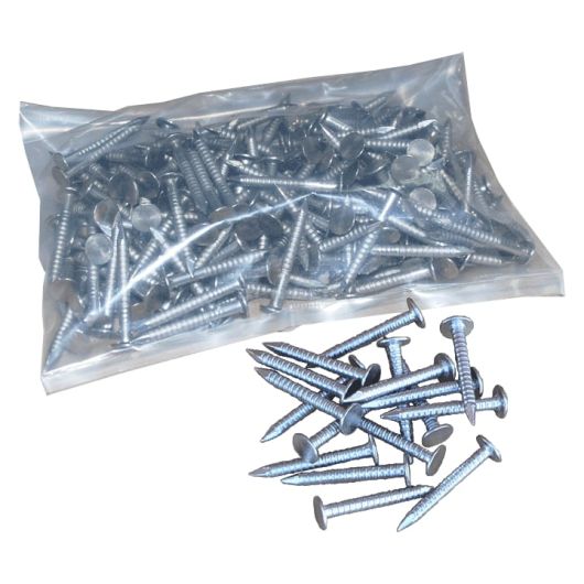 Ring shank nails, also known as annular thread, offer superior holding power in wood. The large 3/8" diameter flat head provides extra bearing surface.